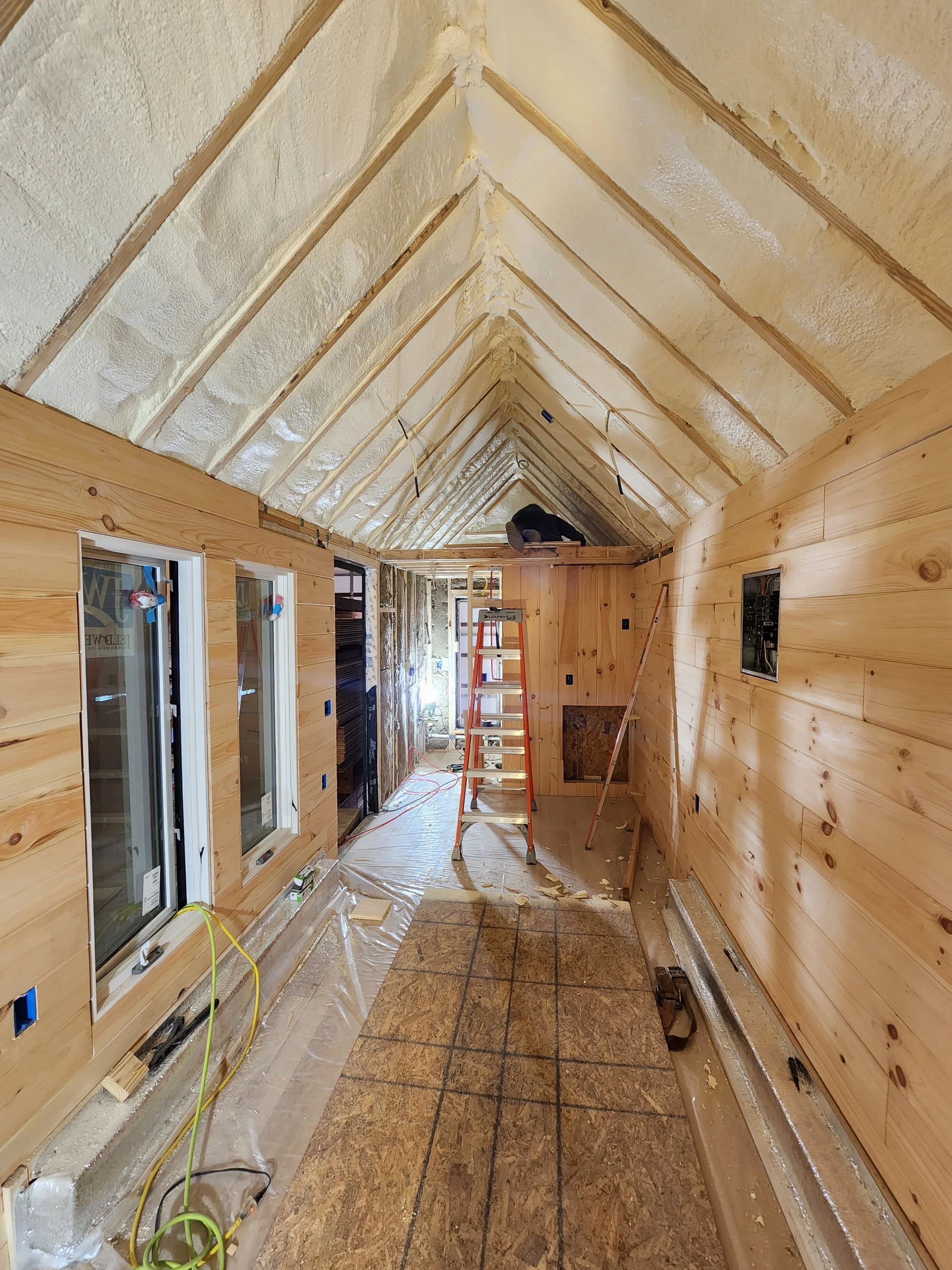 Installation of paneling with closed cell spray foam insulation upgrade.