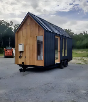 George Kittle standing beside his Nordic and Spruce Weekender tiny home on his Tennessee property.